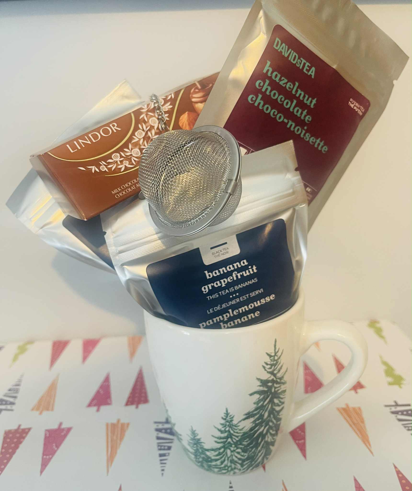 A charming tea basket featuring an elegant evergreen mug, two Banana Grapefruit and one Hazelnut Chocolate David’s Tea loose leaf packets, a hanging ball tea steeper, and indulgent Lindt chocolates Retail $50.